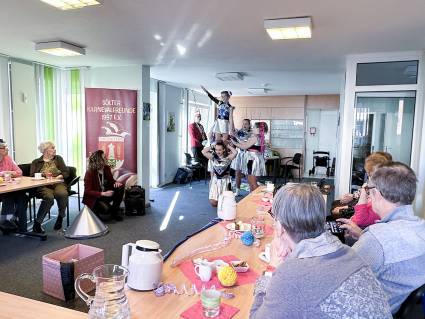 Schon beim Einzug der Karnevalsfreunde war die Stimmung ausgelassen. Die Gäste des Wohnbau-Treffs klatschten begeistert mit und ließen sich von der Energie der Tänzerinnen und Tänzer anstecken. Neben akrobatischen Kunststücken und schwungvollen Choreografien sorgten vor allem die musikalischen Darbietungen für strahlende Gesichter im Publikum.