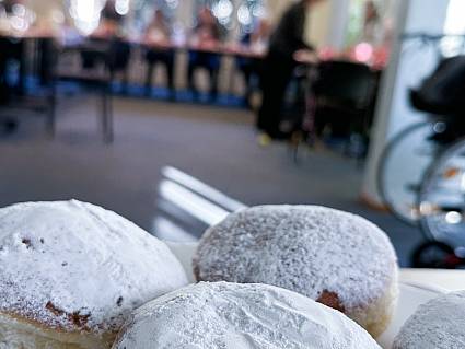Nach dem Auftritt stärkten sich die Karnevalisten bei saftigen Berlinern und kühlen Getränken – eine kleine Pause, die sich alle redlich verdient hatten. Als Dankeschön sammelten die Besucherinnen und Besucher des Wohnbau-Treffs spontan eine Geldspende für den Verein. Eine schöne Geste, die einmal mehr den solidarischen Geist unserer Treff-Gemeinschaft zeigt.