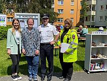 Die Polizei ist zu Gast und steht für offene Gespräche zur Verfügung. Sabine Dömer (Soziales Management der ›Wiederaufbau‹) und Petra Stürmer (unser Soziales Management in Lebenstedt und Peine) werden außerdem vom „Seevierteltreff“ unterstützt, der bei der Getränkeausgabe hilft. Ebenfalls in Aktion: Das beliebte „Gib & Nimm-Regal“, es wird für intensives Tauschen genutzt, während es auch in Lebenstedt Bratwurst vom Grill gibt. Sabine Dömer zeigt sich erfreut: „Heute konnten wir auch neue Familien mit Kindern gewinnen, die sich für unser Angebot hier im Treff interessieren.“